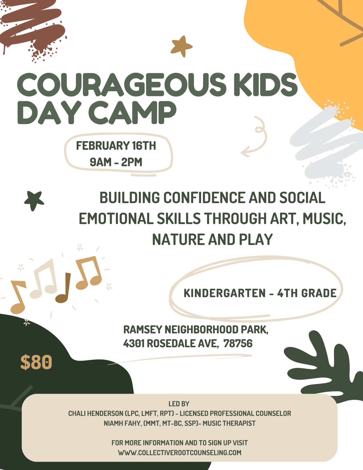 Courageous Kids Day Camp is designed to help children build confidence, strengthen emotional resilience, and develop essential life skills. Led by Chali Henderson and Niamh Fahy, two experienced children’s counselors, the camp uses expressive arts and play to support emotional growth and connection.